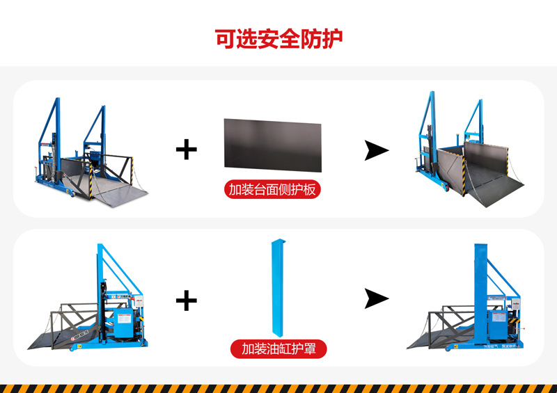 4. 安全防护:液压安全锁防意外坠落、防滑台面、防护栏 / 裙板、限位装置等。